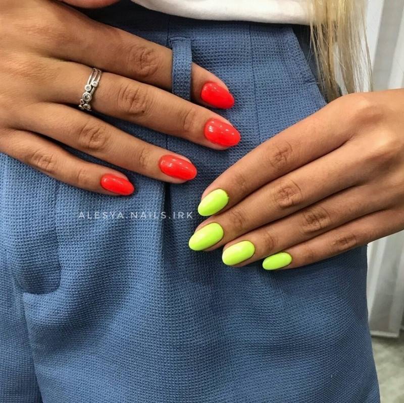 Ягодный, розовый, малиновый оттенки добавляют образу романтичности. Поэтому маникюр лучше всего будет выглядеть в сочетании с платьями. Для путешествий выбирайте более смелые, насыщенные и даже неоновые тона. Это может быть зеленый, оранжевый или желтый цвет. Отлично смотрится синий и красный маникюр. В отличии от предыдущих вариантов, он будет более сдержанным. Каждый из вариантов — прекрасный выбор для жаркого лета.