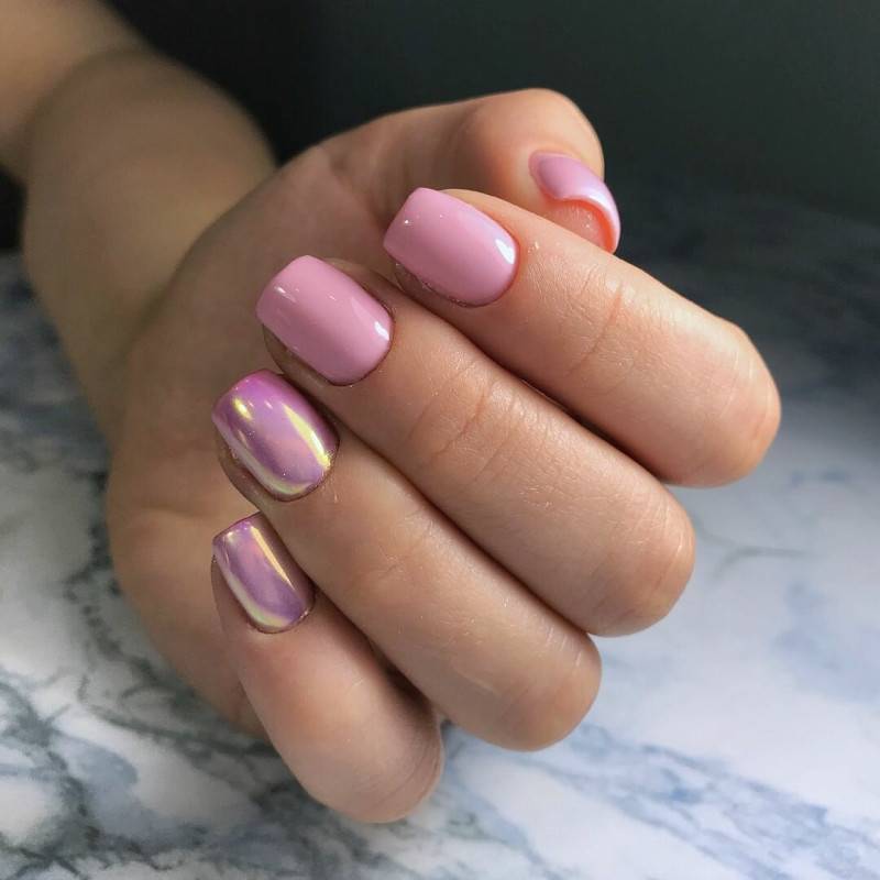 - для однотонного маникюра можно использовать гель-лаки с добавлением шиммера, глиттера, голографических частиц, слюды или кусочек “рваной” фольги. Такой маникюр отличается дуохромным или хамелеоновым эффектом, красиво переливается при солнечном свете. Гель-лаки со “спецэффектами” смотрятся стильно и самодостаточно, поэтому могут быть использованы для создания монохромных нейл-артов.