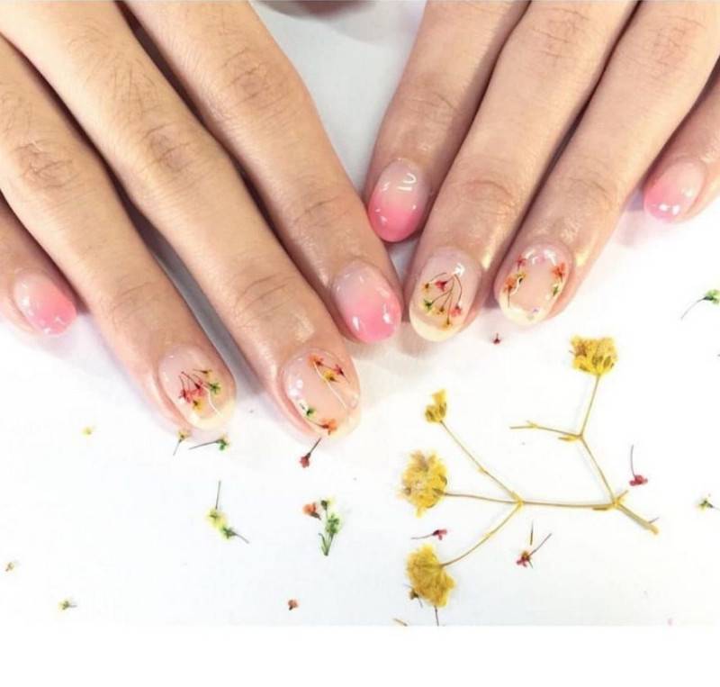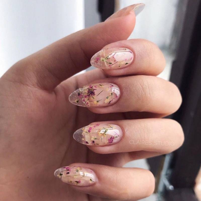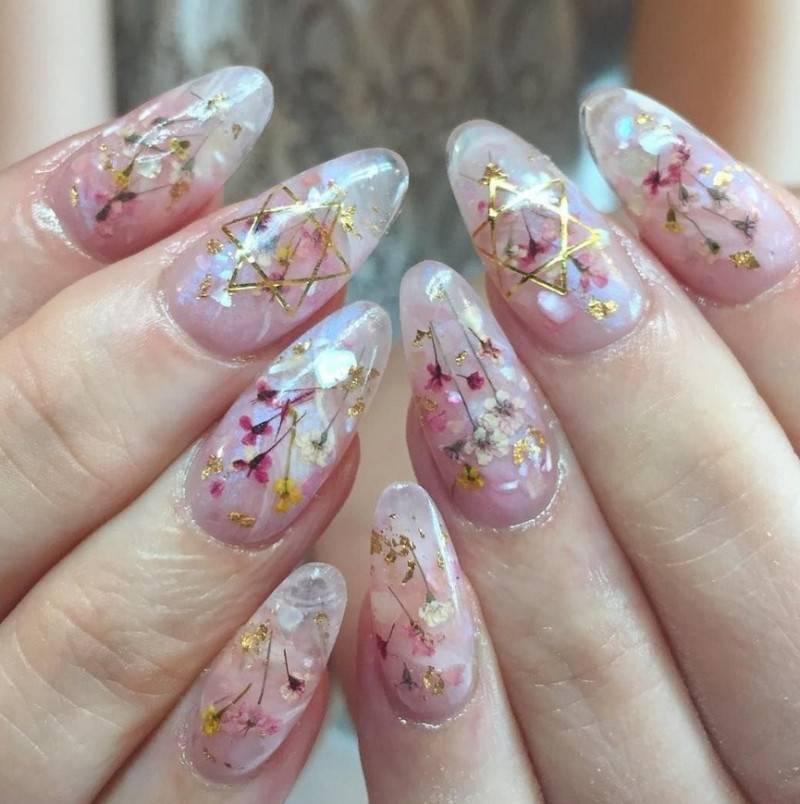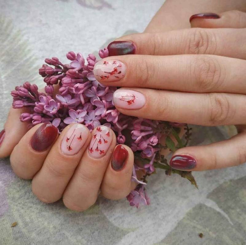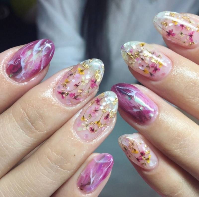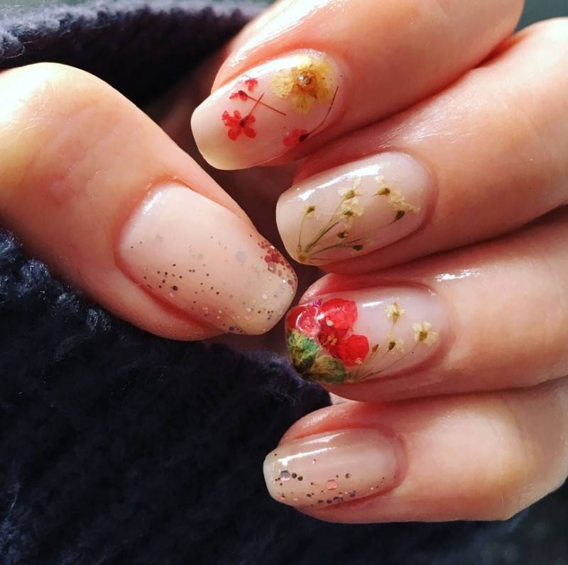 украшение ногтевых пластин засушенными цветами;