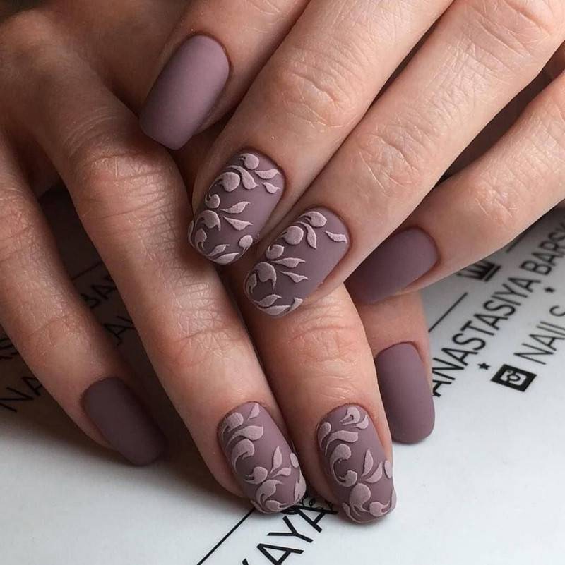 Бархатистое покрытие делает цветовые оттенки намного глубже, благороднее. Если глянец сразу бросается в глаза, то матовые ноготки оставляют стойкое, благоприятное впечатление об их хозяйке. Такой дизайн сохраняет загадку, смотрится аристократично и респектабельно, уместен даже на королевском приеме.