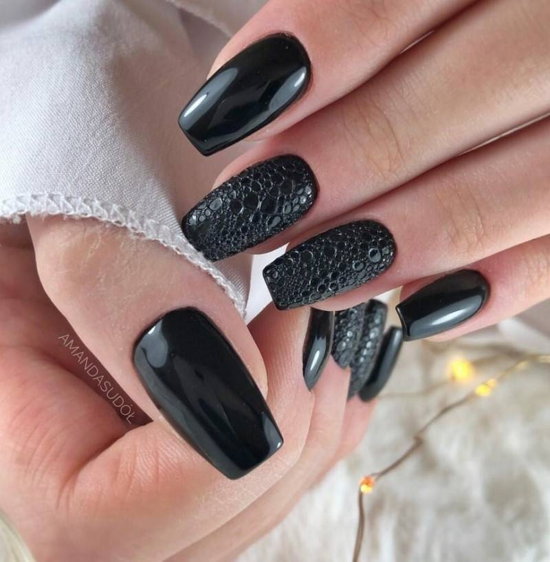 Блестящий дизайн позволяет украсить монохромный маникюр, сделав его гипнотическим и неординарным. Особенно хорошее решение — нанести небольшое количество блесток. С помощью трафарета можно создать на поверхности целую композицию, а также использовать крупный декор, который тоже будет смотреться очень креативно.