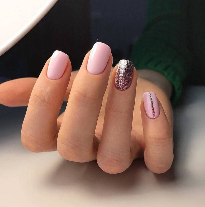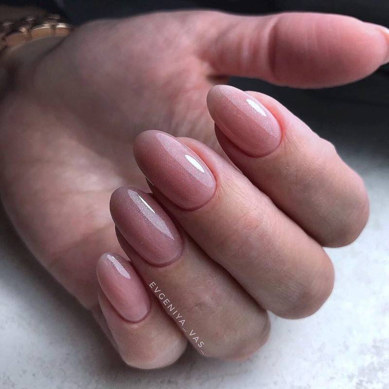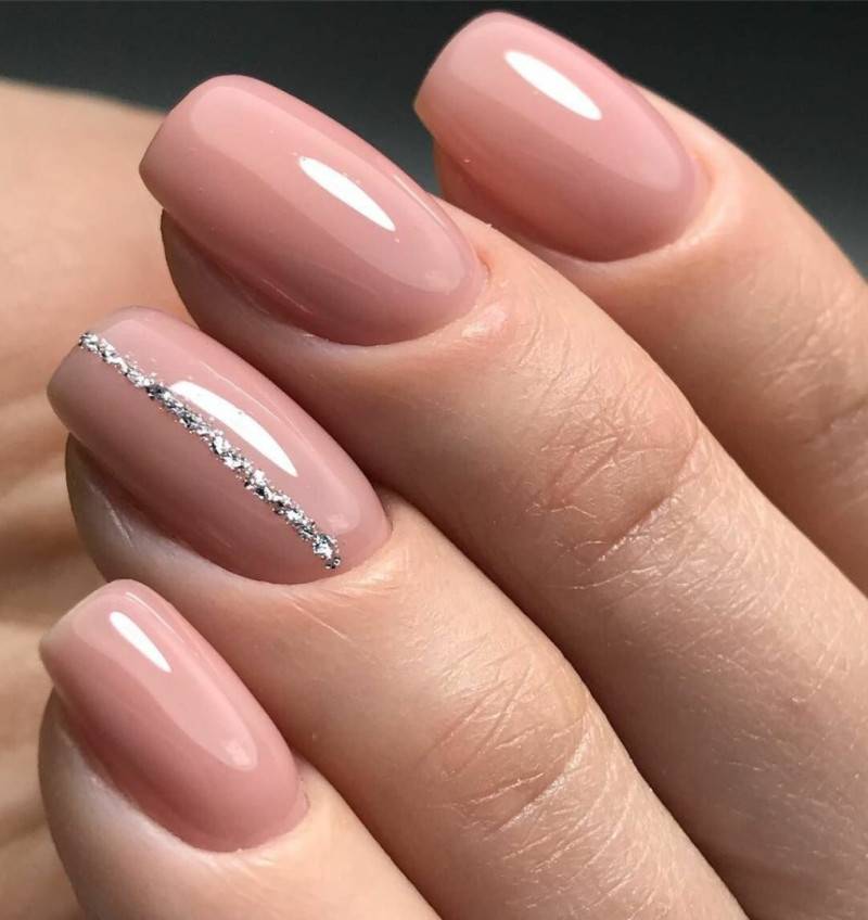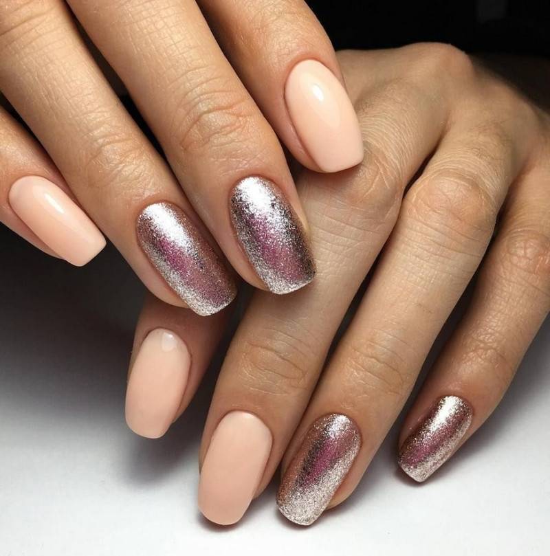 Легкое мерцание оживит однотонное покрытие на ногтях. Для нежного маникюра лучше использовать совсем мелкие блестки. Ими можно сделать растяжку от свободного края ногтя к кутикуле, выделить свободный край или лунки.