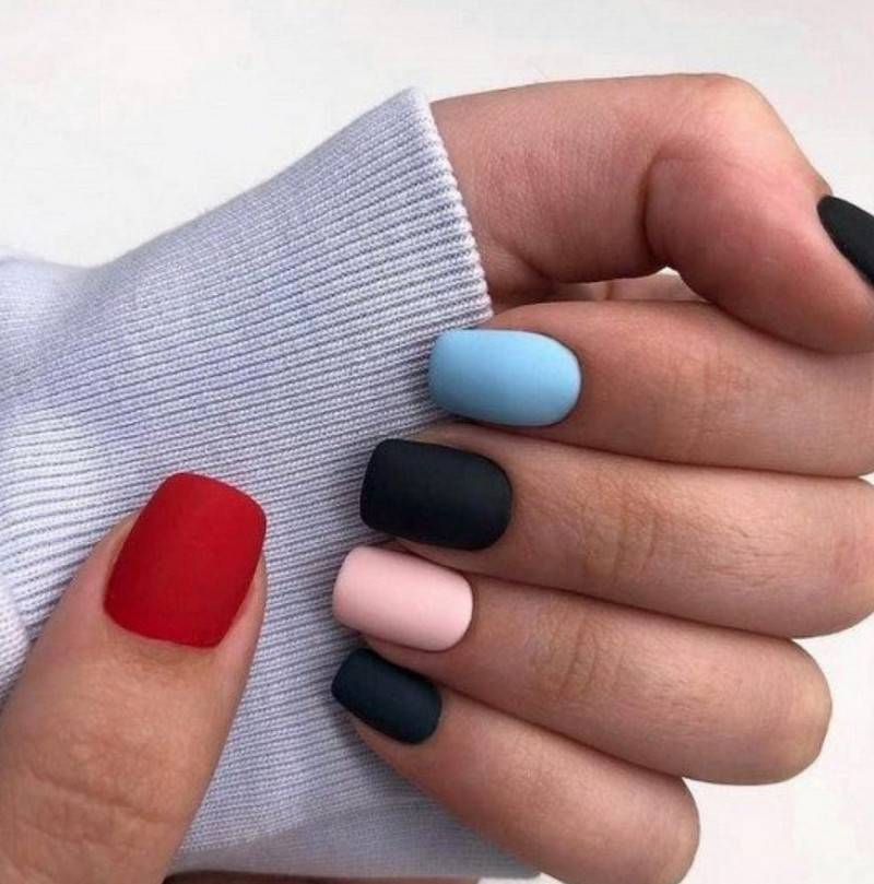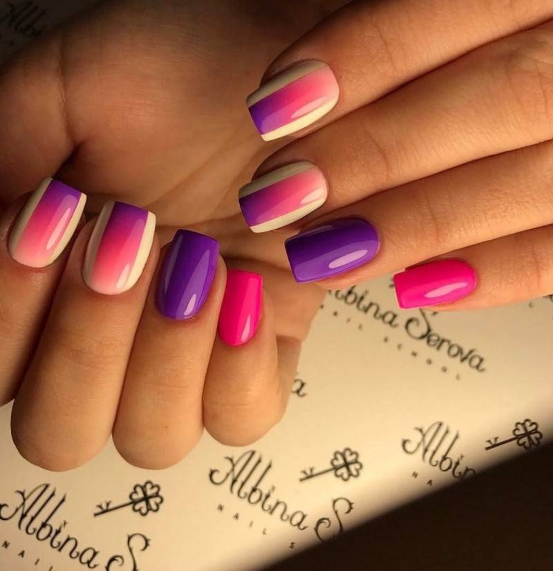 Если хочется чего-то более живого и динамичного, то можно использовать сочетание нескольких цветов. Вариантов такого маникюра может быть настолько много, что можно каждый день создавать новые композиции и не повторяться.