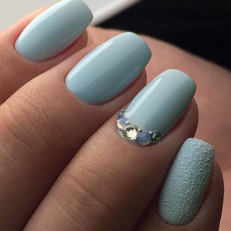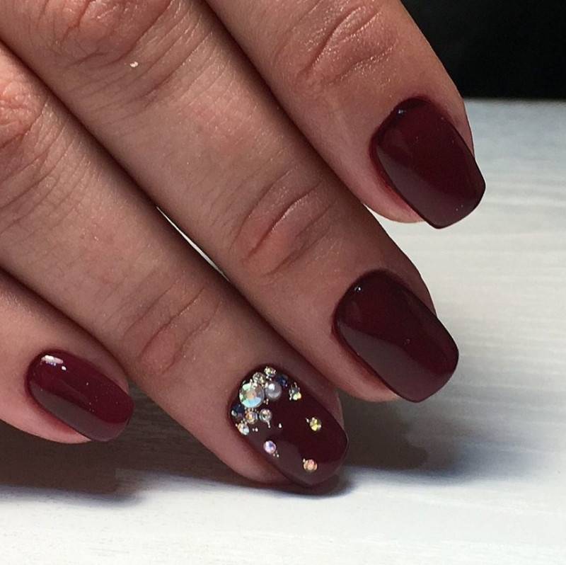 Однотонный маникюр с дизайном глиттером, стразами, рисунками