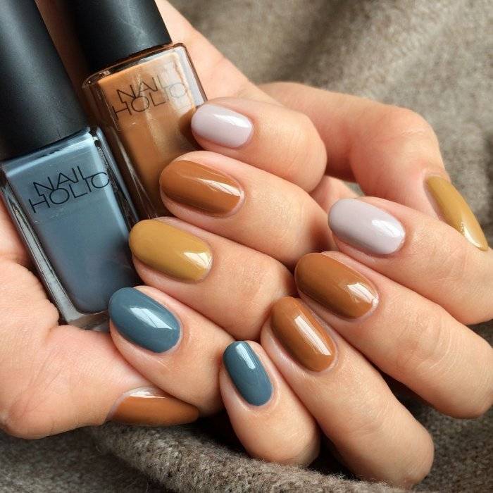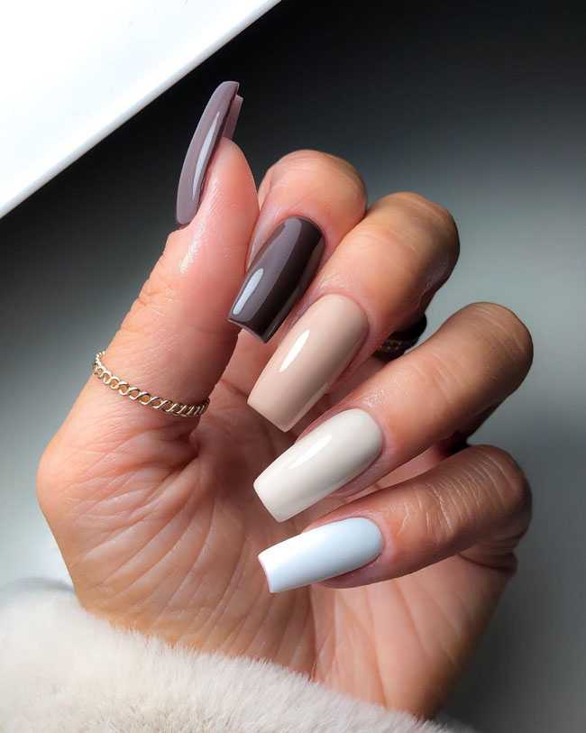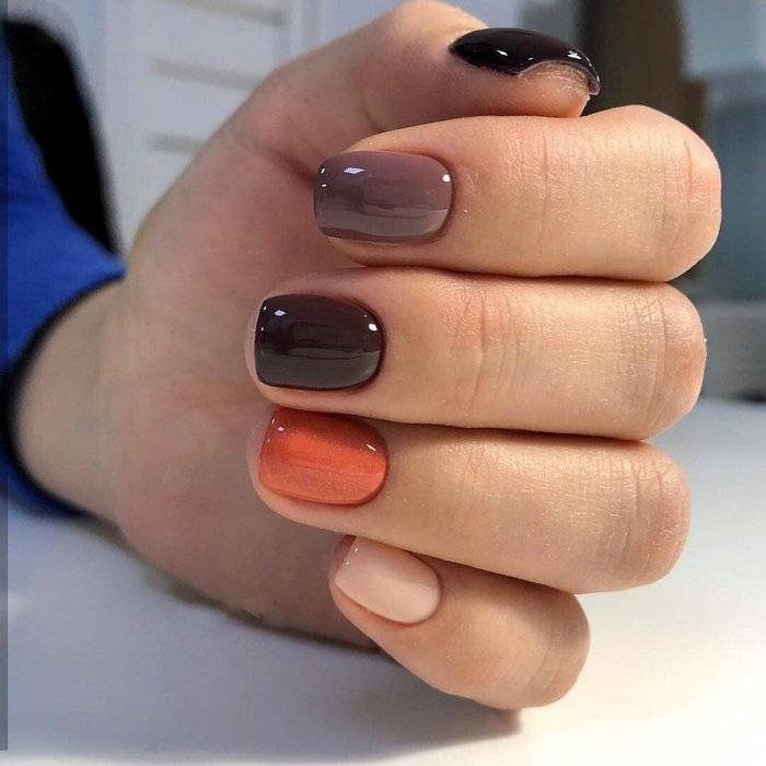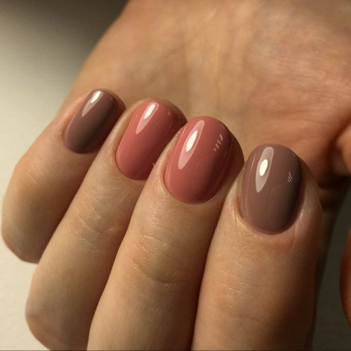 - По принципу нюанса в цветах. То есть подираются цвета близкие по колористике, но все же не разные оттенки одного цвета, так как в этом случае маникюр будет смотреться проигрышно. Прекрасно сочетаются бежевый и шоколадно-кофейный, голубой и синий, бледно-розовый и насыщенно коралловый.