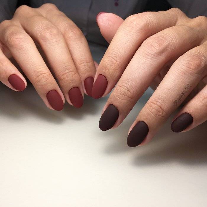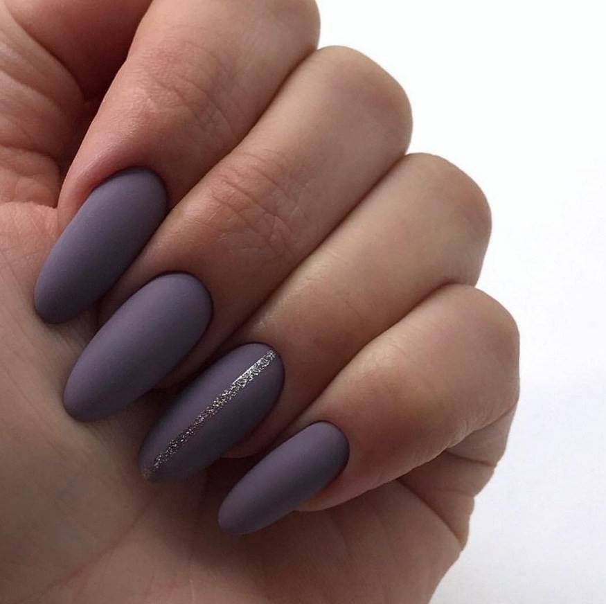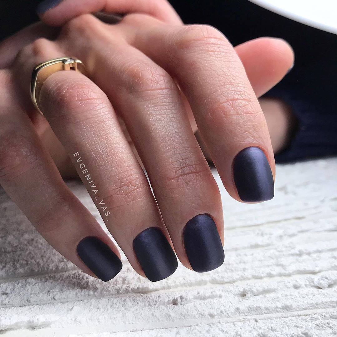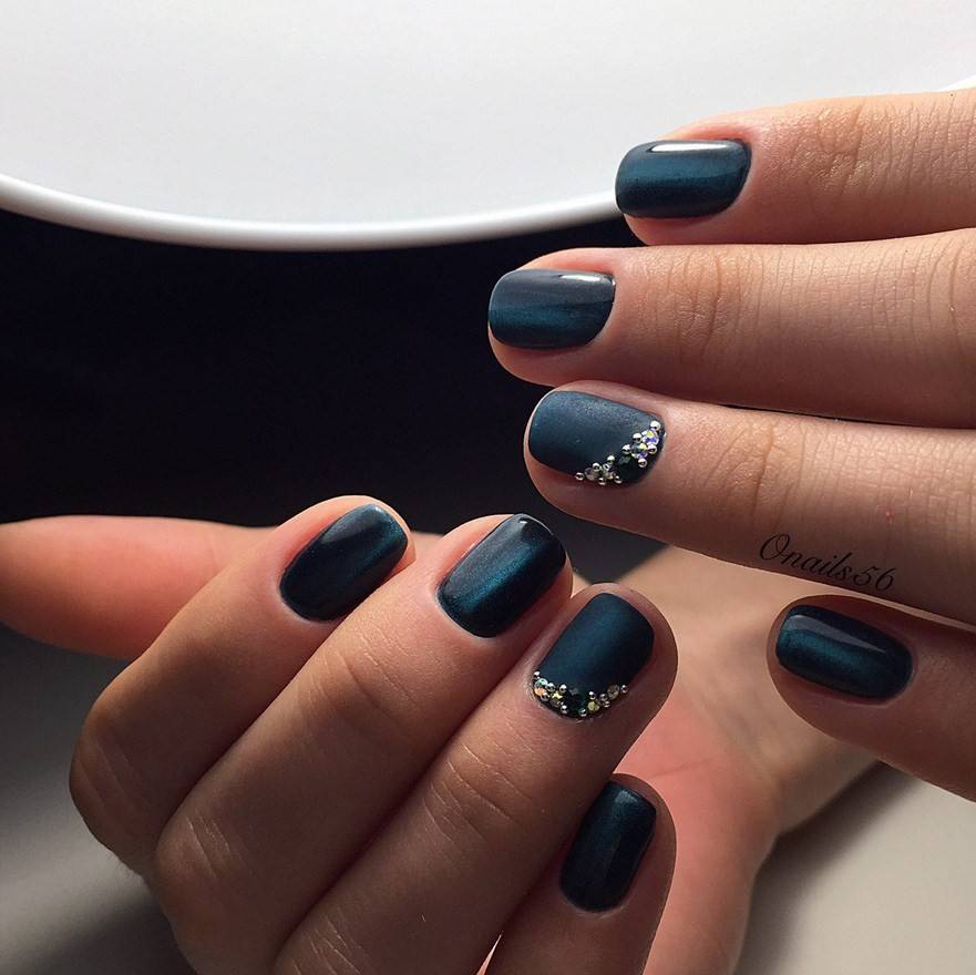 Однотонное покрытие гель-лаком с матовым финишем выглядит благородно и оригинально. Этот вариант одинаково хорош как для светлого, так и для темного покрытия. Разнообразить маникюр помогут стразы, блестки, камифубуки, комбинации с глянцевым покрытием.