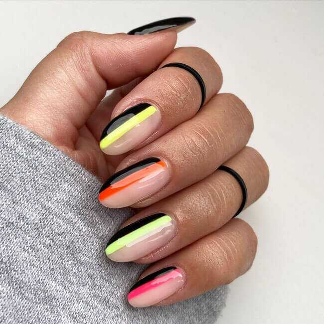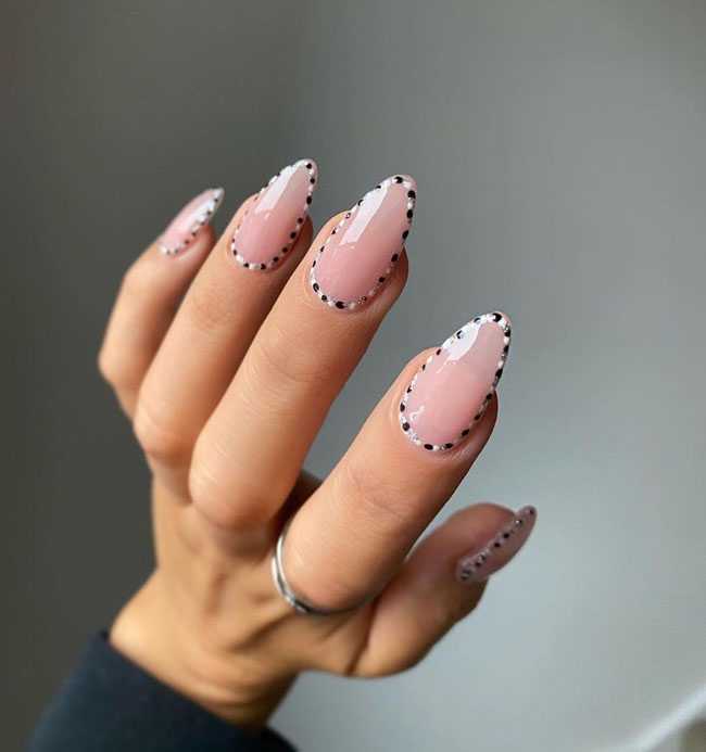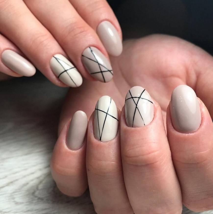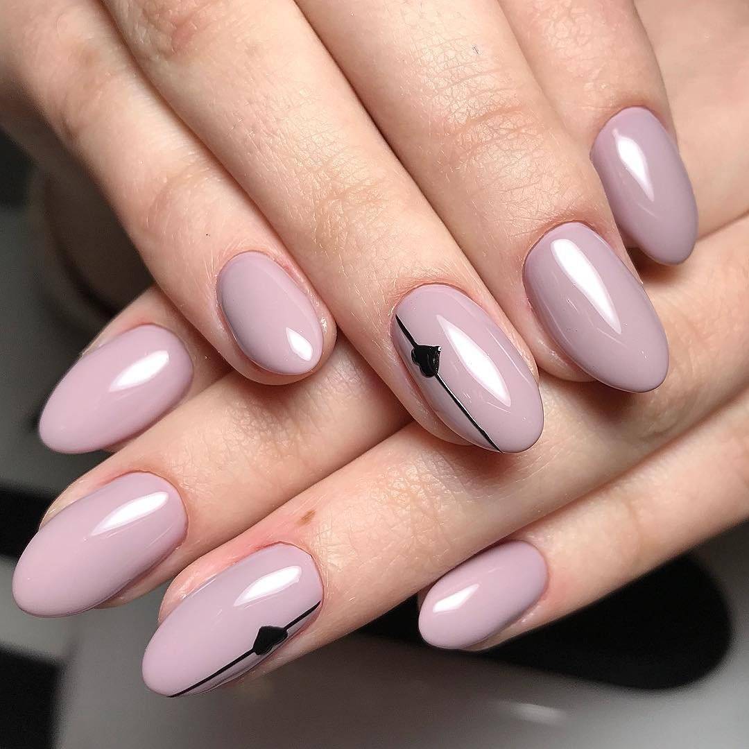 Также очень стильно смотрятся рисунки в виде полосок или точек в минималистичном дизайне ногтей. Можно на нюдовом или прозрачном фоне нарисовать по одной горизонтальной или вертикальной полоске на каждом ноготке. Или на таком же фоне нарисовать по одной точке у основания каждого ногтя, причем сделать это можно как одним цветом, так и при помощи разных цветов.