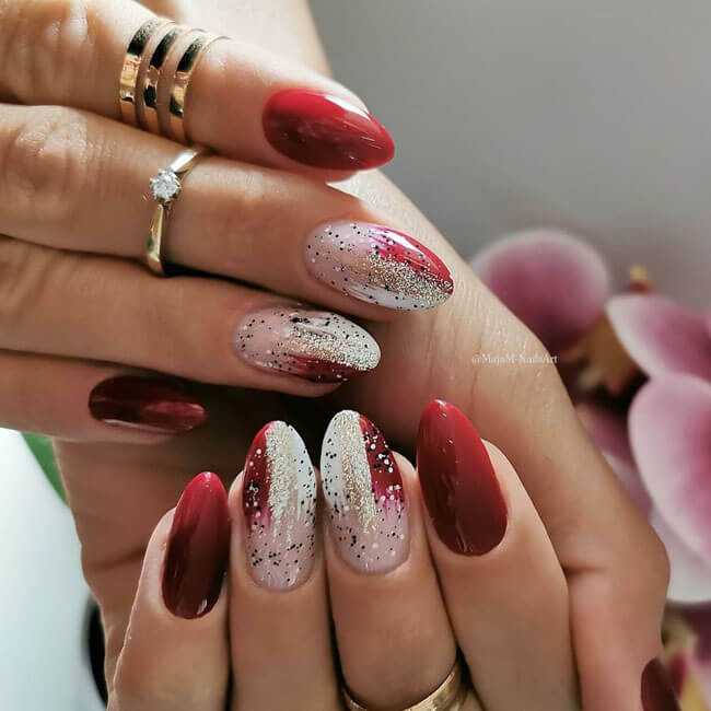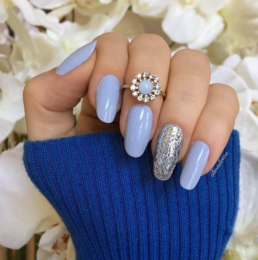 Другой вариант – сделать акцент на 1-2 пальцах, нанеся блестки на всю поверхность ногтевой пластины. Для более праздничного варианта можно использовать глиттер (это те же блестки, но большего размера).