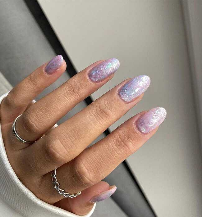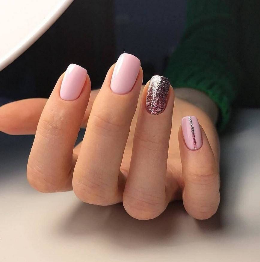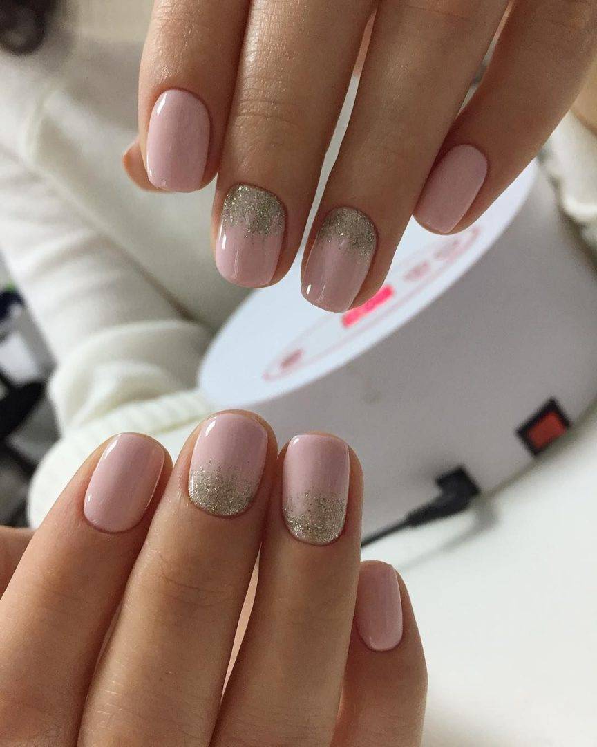 Легкое мерцание оживит однотонное покрытие на ногтях. Для нежного маникюра лучше использовать совсем мелкие блестки. Ими можно сделать растяжку от свободного края ногтя к кутикуле, выделить свободный край или лунки.