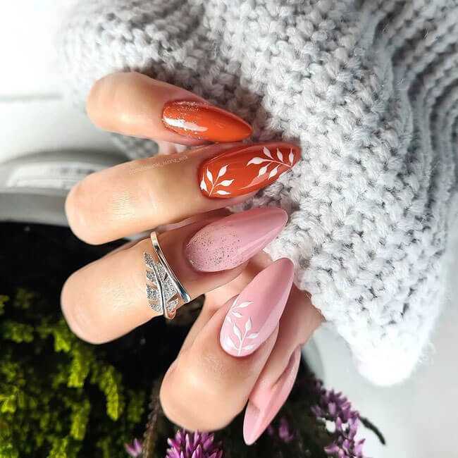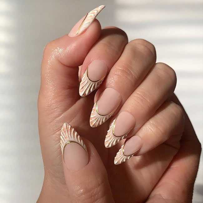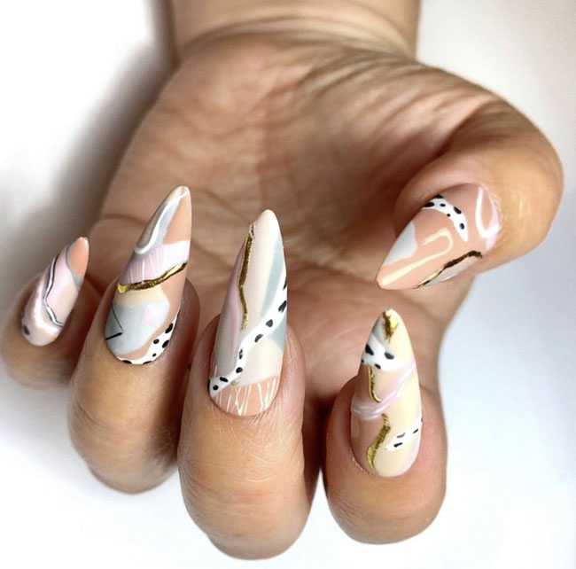 Женственный, изысканный маникюр с растительными узорами и легкой геометрией для ногтей миндальной формы.
