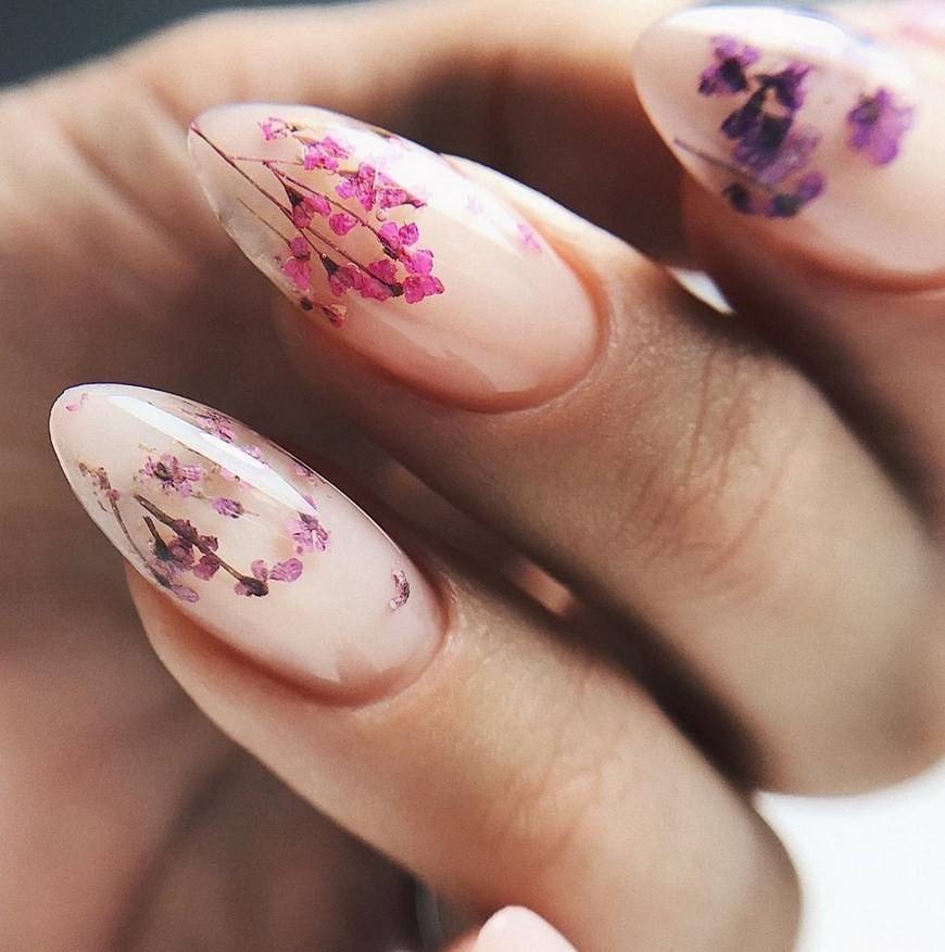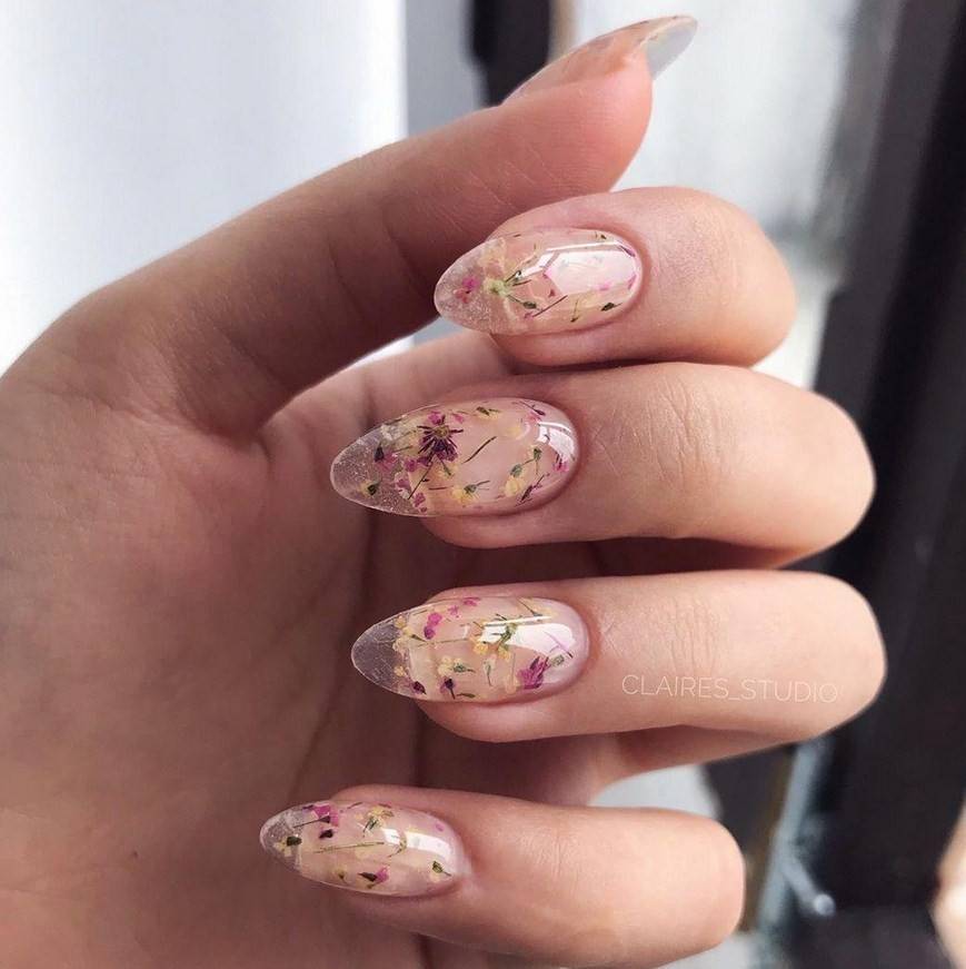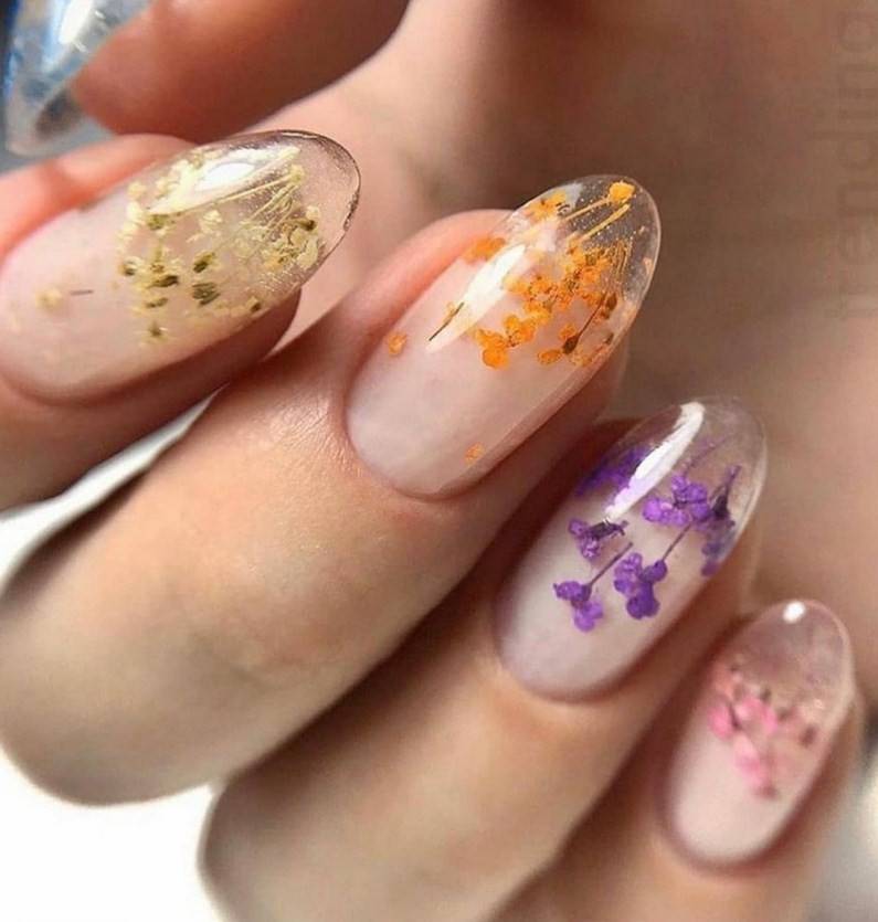 украшение ногтевых пластин засушенными цветами;
