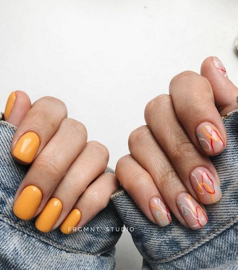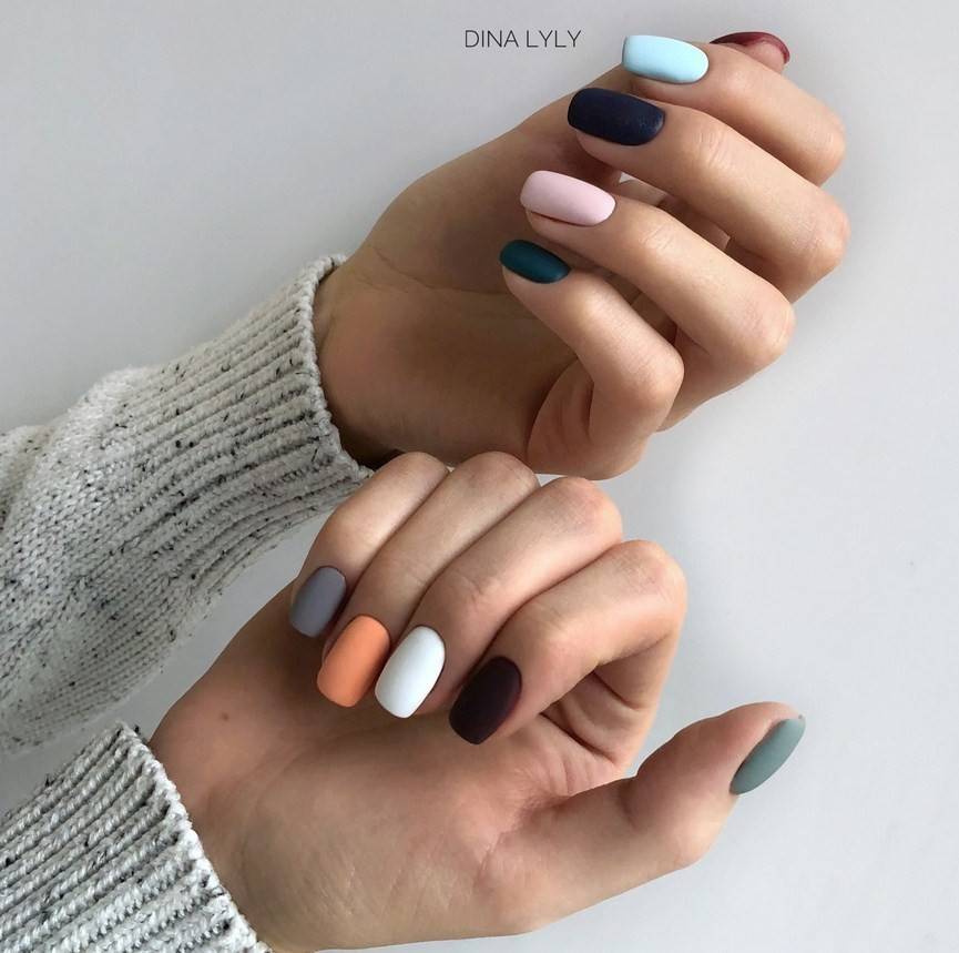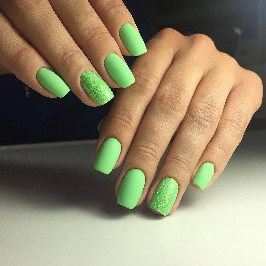 для монохромного маникюра, помимо пастельной цветовой палитры, можно использовать такие оттенки как матовый зеленый, желтый, оранжевый, индиго и другие