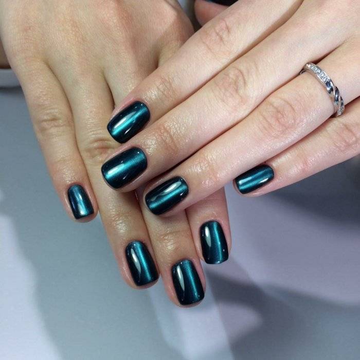 Фото стильного однотонного маникюра с геометрическим рисунком, выполненного магнитным гель-лаком.