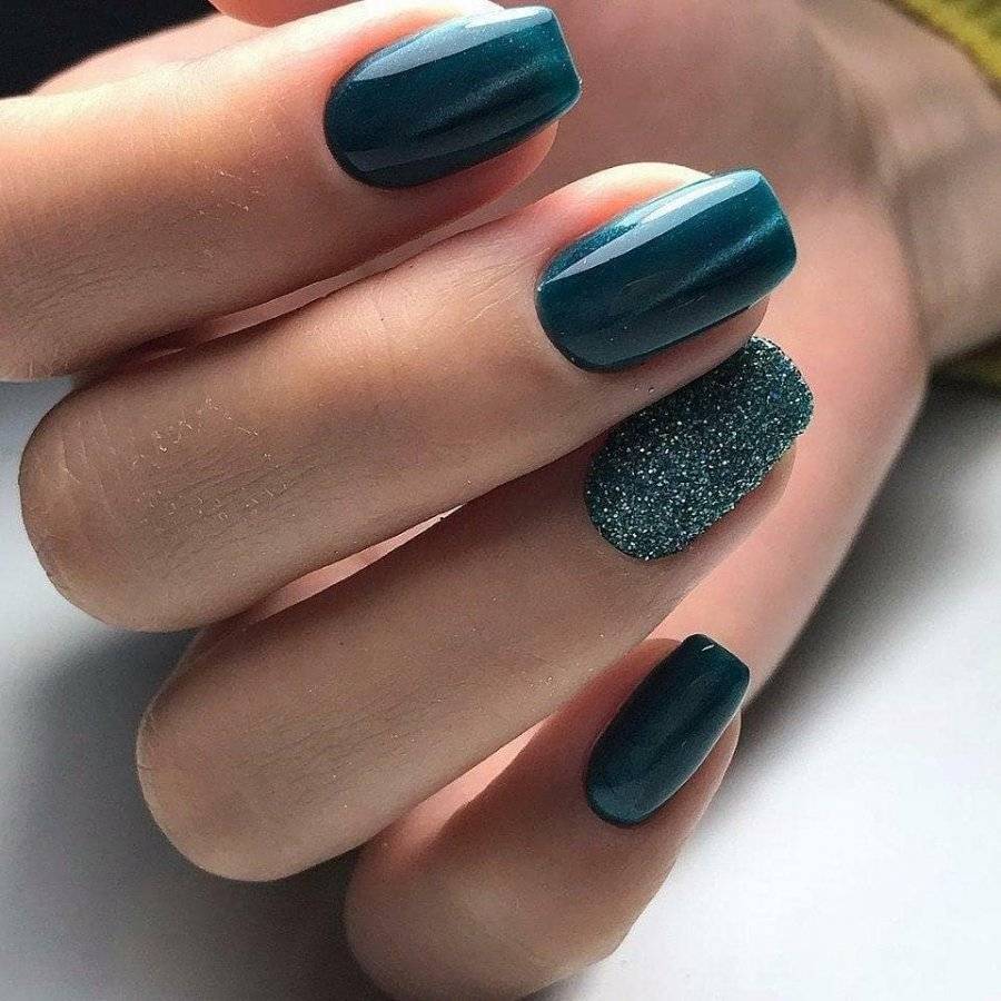 Однотонный маникюр с дизайном глиттером, стразами, рисунками