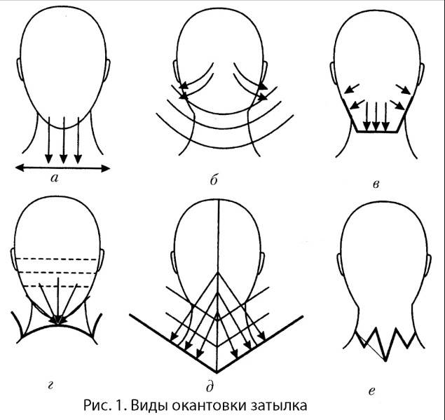 Окантовка затылка может быть универсальной для мужчин и женщин, то есть в форме подковы или треугольника. Существуют и другие разновидности оформления затылочной части стрижки – дугообразный, прямой и овальный типы среза.