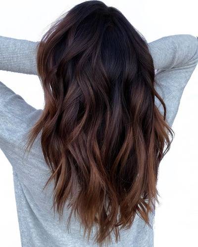 Специальные технологии помогают делать плавные изменения цвета от темного основания к брондированным концам. Этот тип окрашивания имеет второе название – деграде на темных волосах. Чем больше присутствует схожих оттенков, тем больший эффект перелива достигается. В роли базовых тонов используется собственный или природный оттенок. Обычно для подкрашивания прикорневой зоны используются оттенки шоколада, коричневого, каштана и т.п.