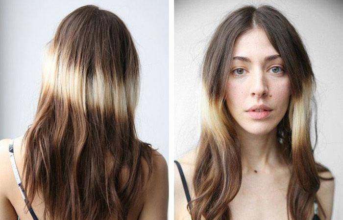 При этом типе окрашивания волос корни становятся темными (блондинки и шатенки часто оставляют свой натуральный цвет), а концы волос — светлыми. Самое главное условие — чтобы цветовые тона составляли гармоничный дуэт, поэтому парикмахеры обычно используют натуральные тона: лесной орех, мед, блонд, коричневый и пшеничный.
