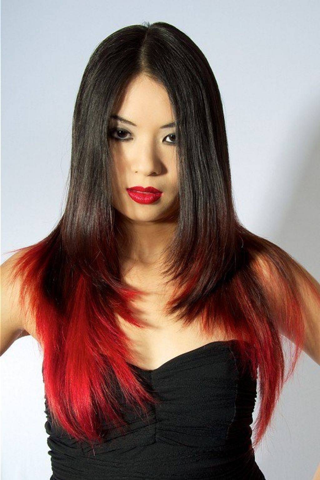 На брюнетках выглядит выгоднее всего, потому что создается контраст цветов и оттенков. Кончики осветляются и на них наносится любой желаемый цвет. Эффектно смотрится красный цвет, коричневый, каштановый, шоколадный и необычные оттенки: синий, зеленый, пепельный.