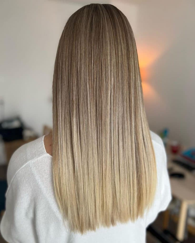 На прямых волосах можно делать окрашивание с использованием не двух, а трех и четырех оттенков (в некоторых случаях это оправдывается длиной). Самая главная рекомендация – не стоит делать резких переходов, заломов. В таком случае окрас будет естественным, будет достигнут эффект «выгоревших» прядей. Но, мастера не советуют делать растяжку цвета обладательницам с ровными и прямыми волосами, в связи с тем, что очень сложно добиться натуральности.