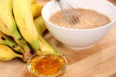 - Приготовление. Потребуется: мед – 2 чайные ложки, банан – 1 шт. Банан размять вилкой или в блендере, мед разогреть на водяной бане. Все смешать.
