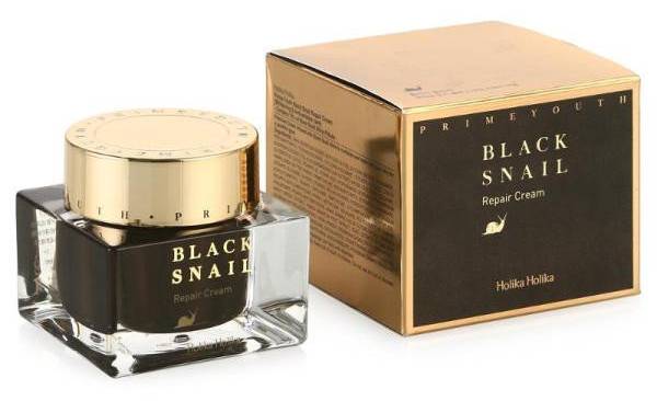 - Holika Holika Prime Repair Snail Cream. На 70% состоит из муцина черной улитки. Производители утверждают, что эта слизь в несколько раз эффективнее секрета садовой улитки. Кроме того, в составе крема содержатся экстракты трав и лекарственных растений. Он отлично справляется с пигментными пятнами, морщинами и рубцами. Стоимость флакона 50 мл — 20 долларов.