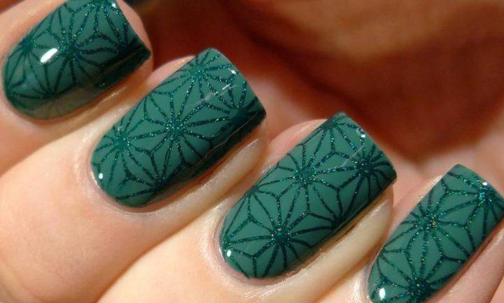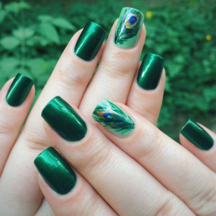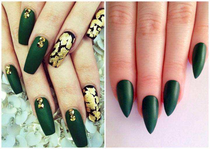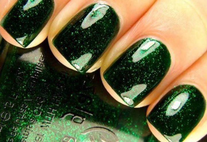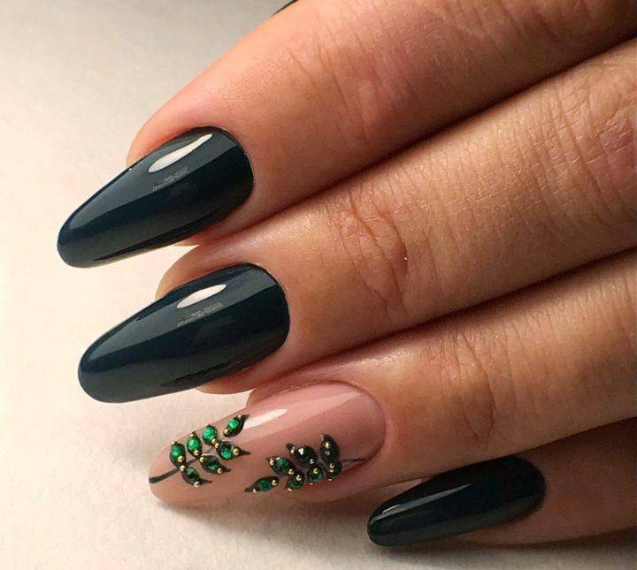Именно темно-зеленые и темно-изумрудные цвета имеют насыщенный глубокий тон. Их особенность в том, что такой цвет будет прекрасен в любом исполнении: глянец, матовый, с блестками, в технике кошачий глаз и омбре. Самым выигрышным украшением смотрятся на темно-зеленом основании полупрозрачные камни, стразы или слегка светло-зеленого цвета.