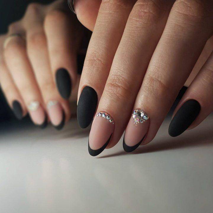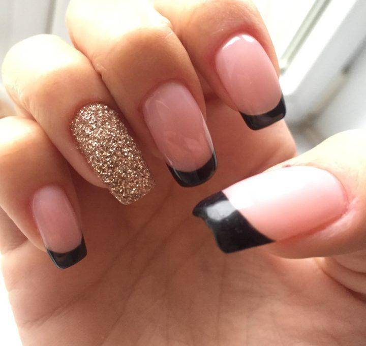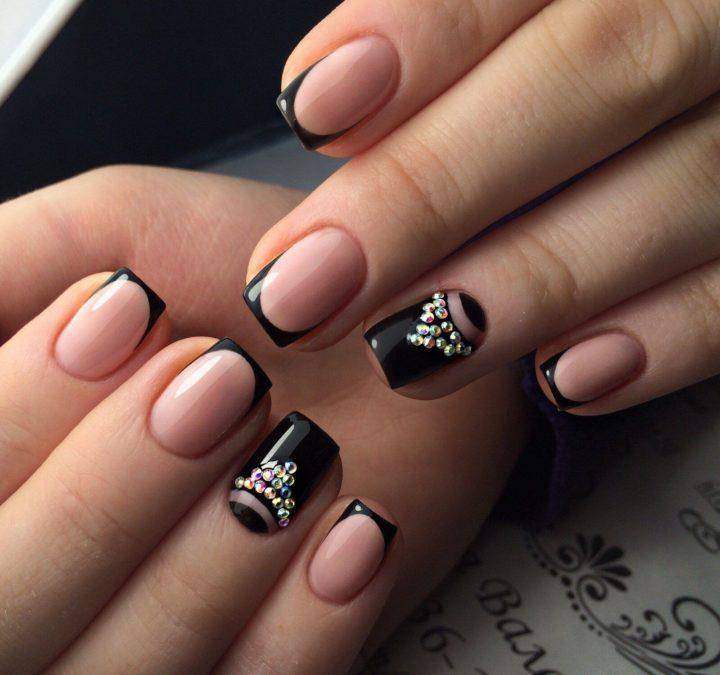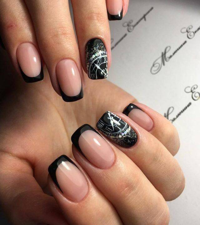 Трендовый и модный черный френч показан с черной основой и металлизированным краем ногтя, классической полупрозрачной основой и черным краем с дополненным одним пальчиков с декором в виде рисунка, страз или глиттера.