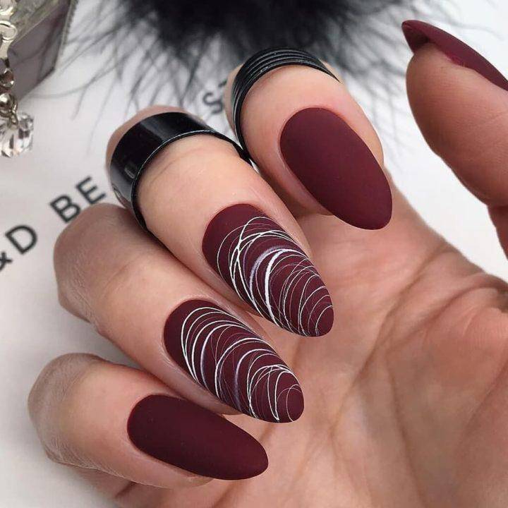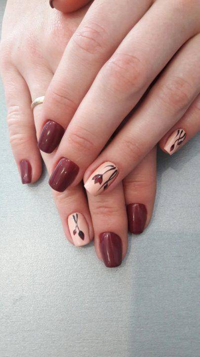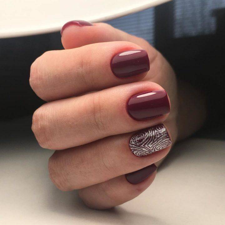 Бордовый цвет ассоциируется с вином, а вернее с горячим глинтвейном, которым можно наслаждаться дома в осенние деньки. Точно также, как и глинтвейн, бордовый согревает своим теплом. Он превосходно смотрится на разной длине ногтей, а также форме.