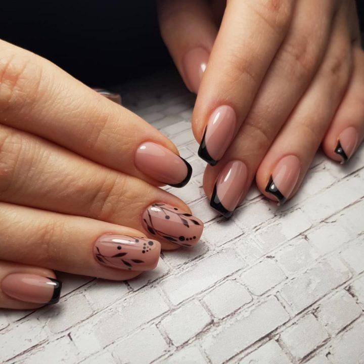 Черный френч выглядит элегантно и эксцентрично. Его обычно предпочитают деловые дамы. В моде классическое сочетание белого и черного. Эти цвета смотрятся очень гармонично. Также актуально будет сделать зеркальное оформление. Черная втирка на нюдовом фоне придаст вашему образу нотку нежности и легкого шарма.