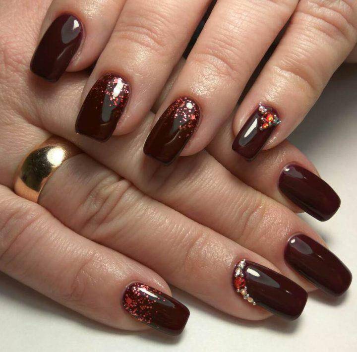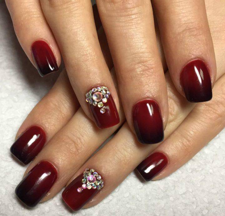 - Отличным вариантом дизайна ногтей будет винный цвет, напоминающий бархат, а потому выглядит такой маникюр весьма роскошно и богато, особенно, если украсить его блестками или стразами или сделать градиент.