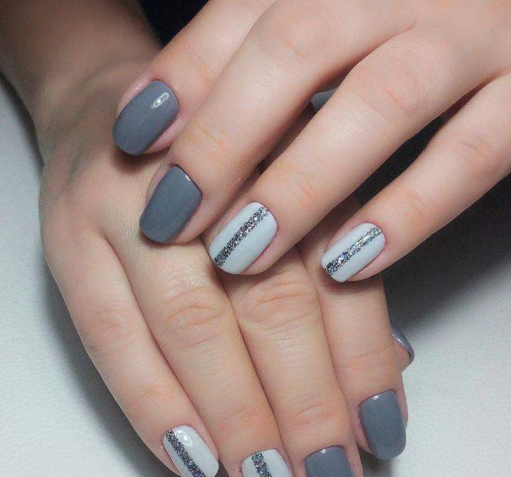 Редко серый цвет мастера делают однотонным. В основном подбираются подходящие друг к другу оттенки серого, где один чуть светлее, а другой темнее. Не редко серый комбинируют с розовым тоном, голубым, бежевым и темно-зеленым. Такие оттенки прекрасно гармонируют с серым цветом, создавая по-настоящему шикарный и стильный маникюр.