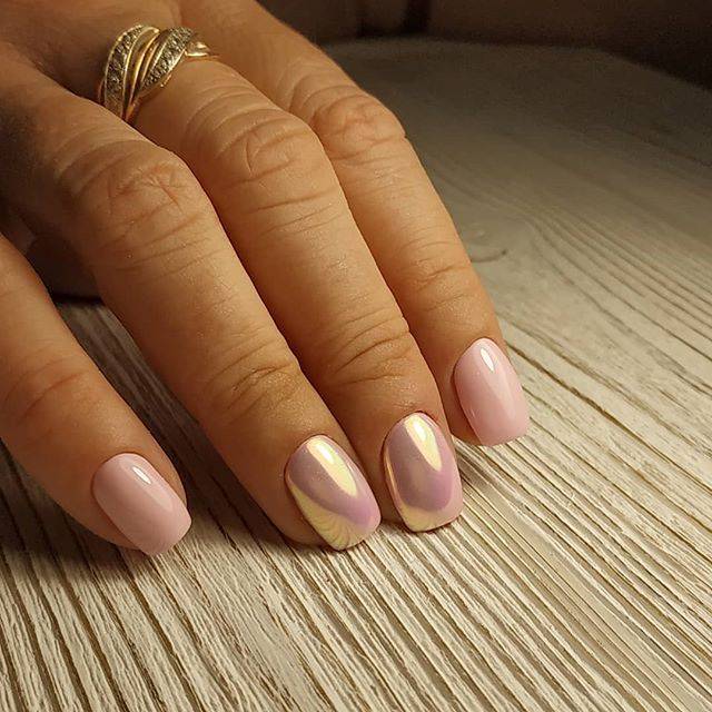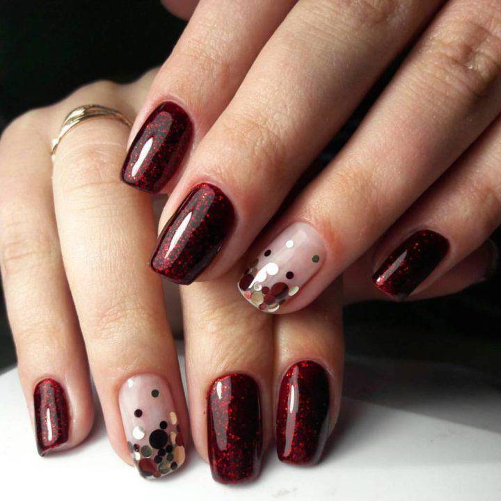 Актуален маникюр, когда блестки расположены плотным слоем по линии френча, а ноготок безымянного пальца покрывается полностью. В тренде оттенки шиммера – золотой, жемчужный, фиолетовый, медный, разноцветный.