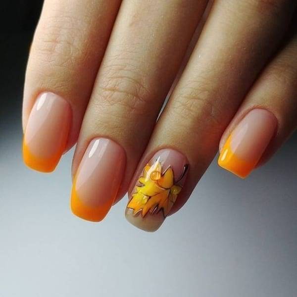 Не иссякающий модный тренд – это френч, который может стать отличной базой для создания осеннего маникюра. Как вариант, может использоваться классический френч с нюдовым окрасом и белым кончиком ногтя. На таком фоне можно создать уникальный осенний дизайн.