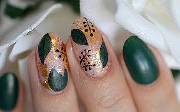 Стильно будут смотреться веточки и листья в пастельном или темном лаке. За нотки изящности в этом дизайне могут отвечать легкие блестящие акценты на поверхности листьев.