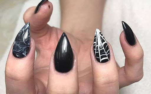 Оригинально осенью выглядят ноготки, покрытые черно-белой паутинкой. Эта техника при помощи нанесения рисунка тоненькими линиями специальных гелей позволяет создавать строгую геометрию узоров и абстрактных образов.