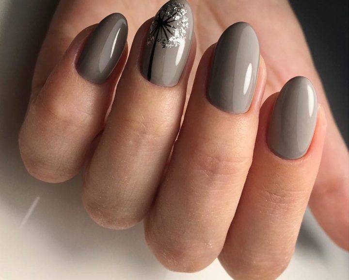 Серый цвет является еще одной главной тенденцией в осеннем маникюре. Такой маникюр весьма сдержанный, но в тоже время стильный вариант. Его легко комбинировать с разной одеждой, он подходит на короткие и на длинные ноготки. Серый маникюр гель-лаком – это прекрасная основа для создания на таком покрытии всевозможных рисунков, а также украшений.