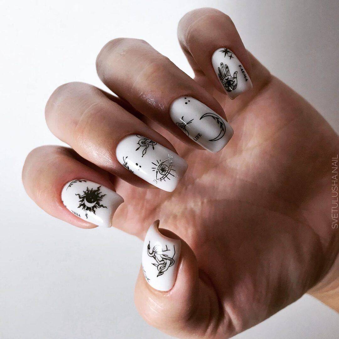 Сами рисунки рекомендовано выполнять в чёрных или же белых тонах. Основным покрытием лучше всё же сделать пастельные оттенки. Для торжественных моментов можно украсить ноготки стразами, чтобы придать им гламурности.