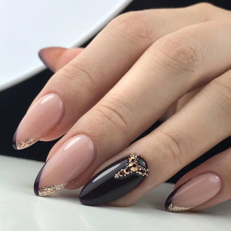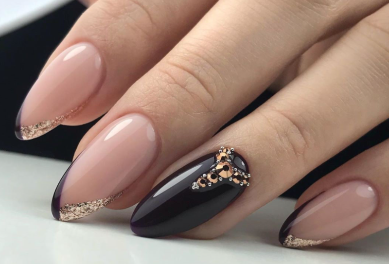 Достаточно выполнить не более пары акцентов, чтобы не загромождать оформление. Удачный пример – украшение одного ноготка на руке стразами.