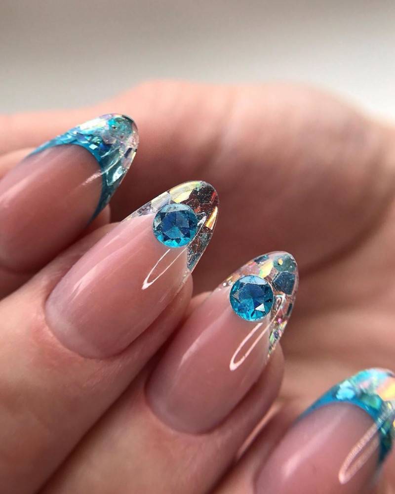 Французский маникюр с прозрачным свободным краем на ногтевой пластине особенно актуален в этом сезоне. Эта техника выполняется исключительно на нарощенных ногтях, потому что свободный край заполняется различными украшениями. В результате получилась фантастическая и невероятно стильная складная куртка для аквариума. Осенью и зимой такой дизайн будет смотреться особенно эффектно.