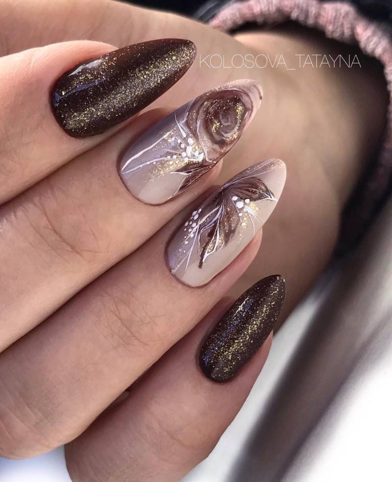 Осенне-зимний сезонный маникюр не может обойтись без рисунков, особенно тематических. Для осеннего нейл-арта лучше всего выбирать более теплые тона. Среди них преобладают насыщенные и глубокие оттенки, такие как шоколадный, винный, бордовый, коричневый, изумрудный или сливовый. Для такой основы отлично подойдут украшения в виде золотых узоров, дополнений стразами или глиттером.