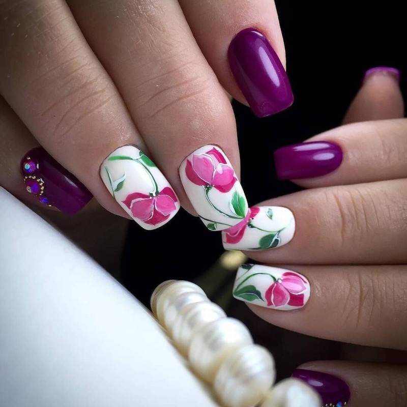 В летний период в тренде сочные, яркие, неоновые тона. Модным исполнением на однотонном покрытии будет дизайн с различным декором.