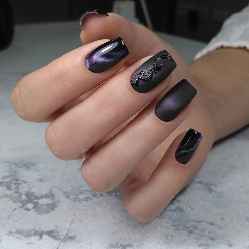 Привлекательный перелив дизайна «кошачий глаз» станет непревзойденным украшением маникюра сезона. Эта техника определенно выглядит наиболее эффектно на темной основе. В качестве дополнения можно сделать акцент штриховым градиентом на нескольких ноготках. Это придаст металлическому нейл-арту оригинальности и элегантности. Также можно использовать дополнение в виде тематического узора или страз.