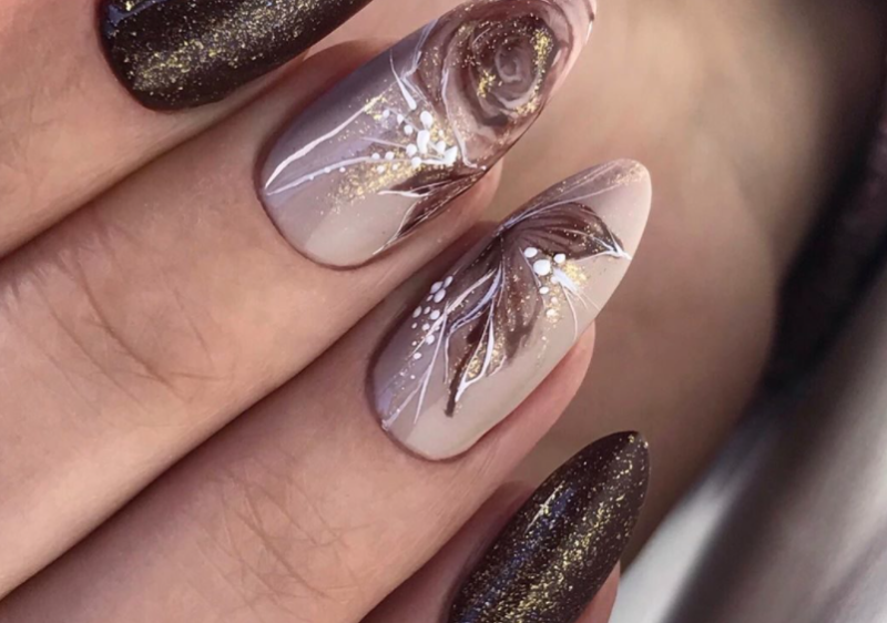 В шоколадной палитре стоит выбирать горькие оттенки. Шоколадный маникюр на пике популярности этой осенью. В этом цвете можно смело сделать френч или же украсить его фольгой или рисунком. С таким маникюром ваши ноготки не останутся без внимания.