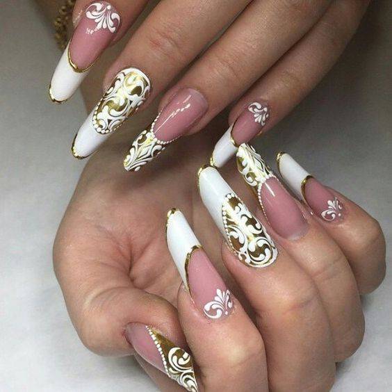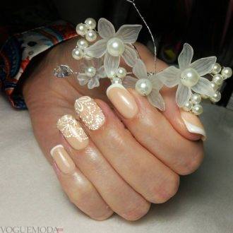 Красивый вариант ажурного, в том числе свадебного оформления с множеством узоров, вензелей. С помощью стемпинга можно получить кружева. В моде кремовый фон.