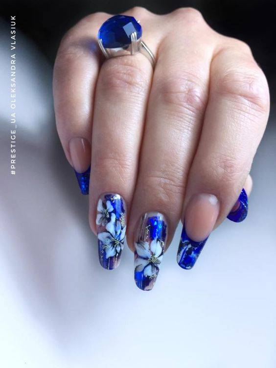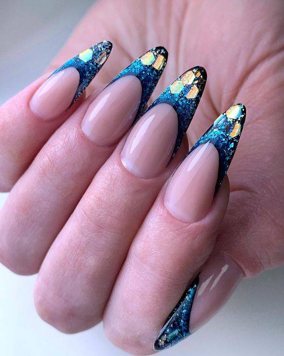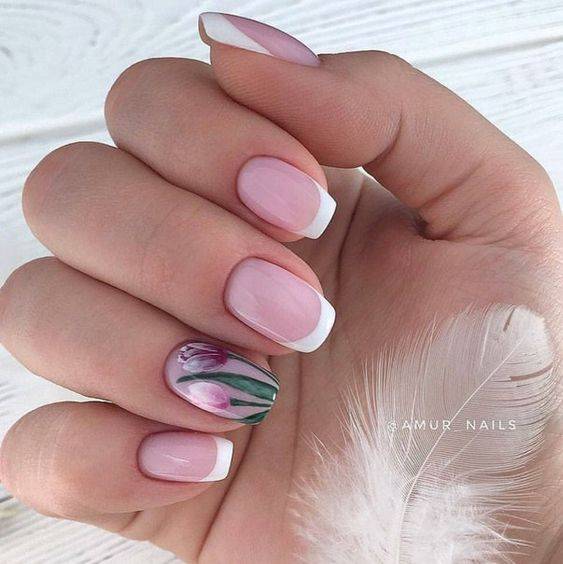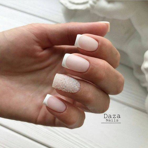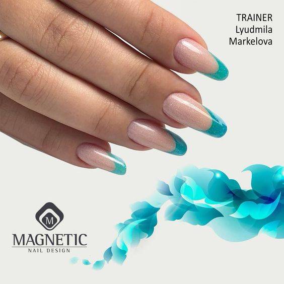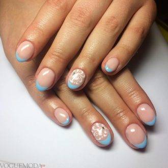 Предпочтительно это классический или лунный французский маникюр в голубых пастельных тонах, с аквариумным акцентом на нескольких пальцах.