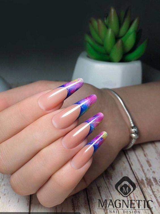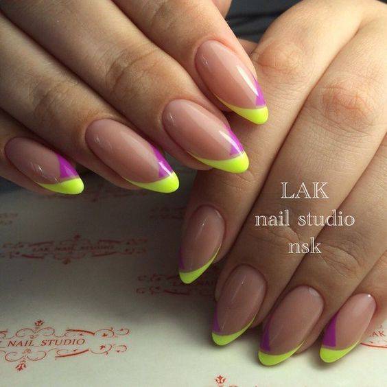 Еще одним трендом сезона станет разноцветный френч, который отличается сочетанием палитры оттенков. Так, например основа может выполнена красным или зеленым цветом, а окантовка синим или оранжевым. Такое яркое и веселое сочетание не только добавит свежести летнему образу, но и вполне лояльно разбавить скучные зимние будни.