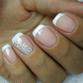 В данном варианте классический френч, в котором линия улыбки будет оформлена не стандартной белой полосой, а к примеру в виде кружевной окантовки, будет выглядеть довольно нежно, романтично и неординарно.