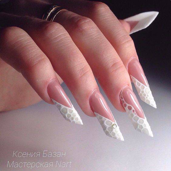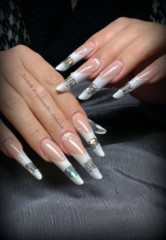 - Длинные ногти. Чтобы полюбившийся французский дизайн выглядел менее претенциозно, забудьте о стразах, остановив свой выбор на кружеве, игре цвета и текстур.