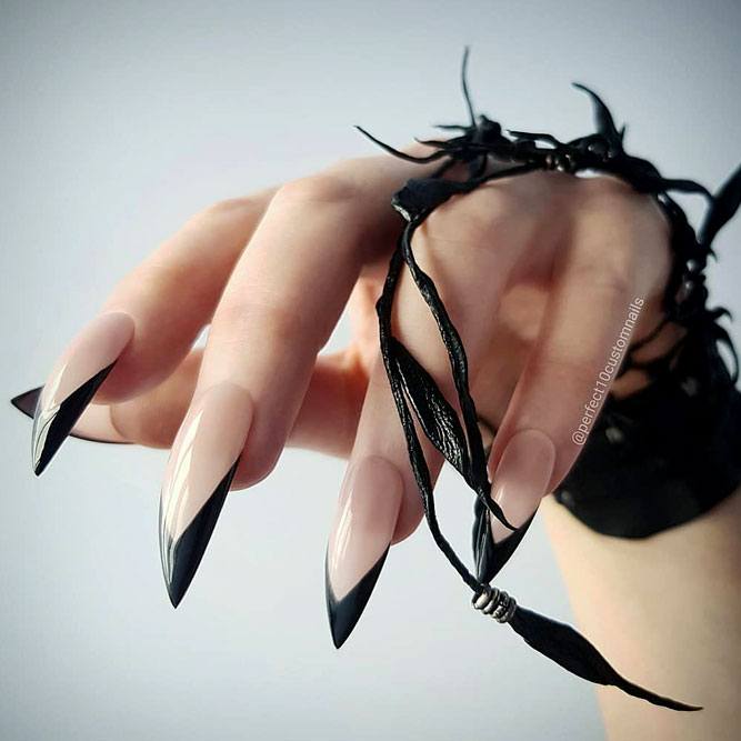 - Острые или миндалевидные ногти. При острой форме края ногтя, даже недостаток длины не является противопоказанием к френчу. Главное, не используйте светлые оттенки, они визуально «съедают» базовый шеллак и выглядят неопрятно.