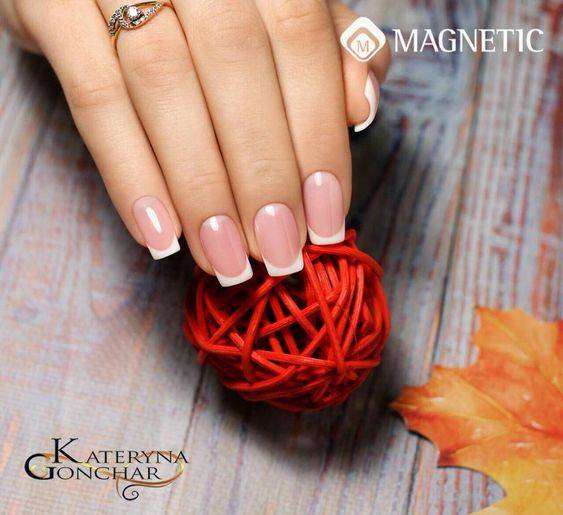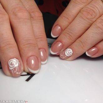 - Короткие ногти. На коротких ногтях уместен лаконичный френч с молочной полоской, по сути, удлиняющей ногтевую пластину. Избегайте обилия рисунков, ажурных декоративных элементов и страз.